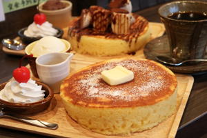 ◇懐かしい喫茶店の雰囲気を演出。厚さ3cmほどのホットケーキは、焼き上がるまで20分。ひきたて豆をサイフォンでいれるコーヒーに合うスイーツのひとつ。